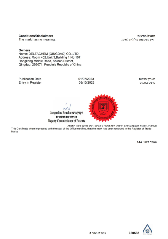 2023年11月20日,青岛德达特化集团顺利完成“欧稳德 OMNISTAB”商标在以色列地区的注册。目前,商标已通过以色列当地商标局核准,并成功获得“商标注册证书”,证书有效期为2023年7月1日至2033年1月31日。