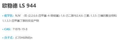 欧稳德LS944与紫外线吸收剂合用具有协同效果,推荐与紫外线吸收剂OMNISTAB UV326/UV328/UV329等配合使用。