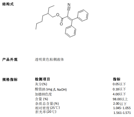 此外,OMNISTAB UV3039与树脂相容性较好,不着色,同时具有吸收率高、无毒、无致畸作用、对光、热稳定性好等优点,也广泛应用于软质、硬质聚氯乙烯等塑料和硝酸纤维素、丙烯酸树脂聚氨酯涂料中作光稳定剂。