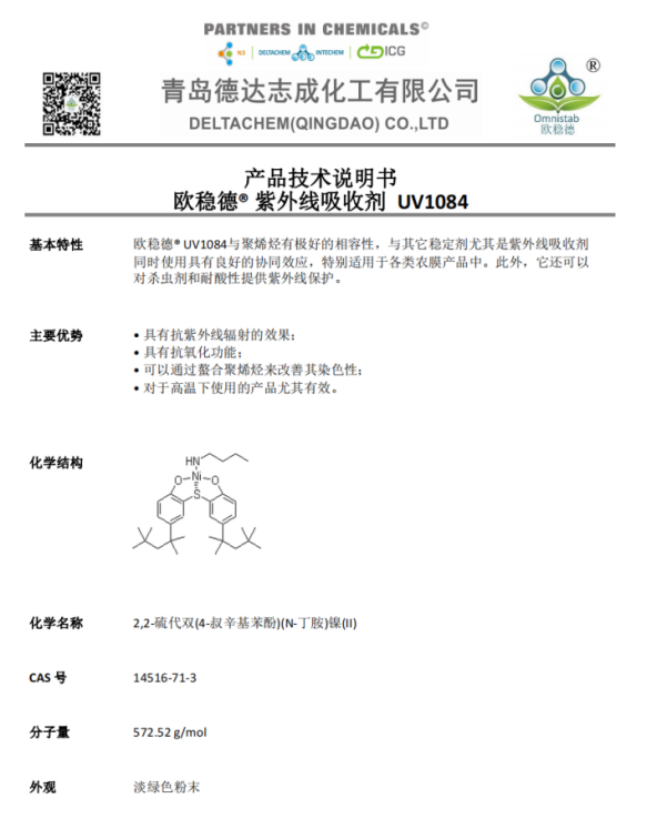 欧稳德紫外线吸收剂UV1084主要应用于聚乙烯棚膜、农膜,具有优异的耐农药、耐酸性,在聚丙烯、聚乙烯纤维、人造草坪等领域具有广泛应用。本品也可以与其他形式的稳定剂很好地配合使用,尤其是紫外线吸收剂类产品,在聚烯烃产品中具有极强的兼容性,在PE农用薄膜以及PP草皮等产品中具有极高的稳定性,可抵抗农药以及酸性侵蚀。同时也适用于PE和PP农用薄膜、胶带等制品。
