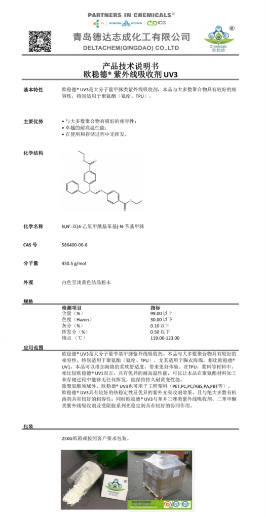 OMNISTAB UV-3是一款大分子量的甲脒类紫外线吸收剂,与大多数聚合物具有较好的相容性,特别适用于聚氨酯(氨纶、TPU、RIM),尤其适用于胸衣海绵、聚氨酯泡沫材料、聚氨酯皮革、膜材料、板材和涂料产品中。与同为甲脒类的OMNISTAB UV-1产品相比,UV-3可以增加海绵的柔软舒适度,为使用者带来更好的制品体验。