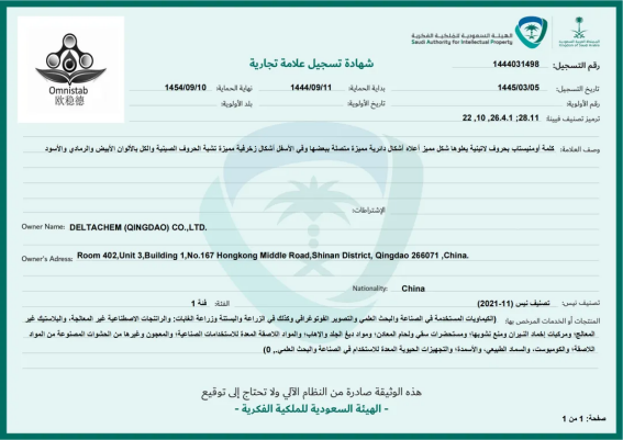 2023年11月20日,青岛德达特化集团顺利完成“欧稳德 OMNISTAB”商标在沙特地区的注册。目前,商标已通过沙特当地商标局核准,并成功获得“商标注册证书”,证书有效期为2023年4月2日至2032年12月13日。