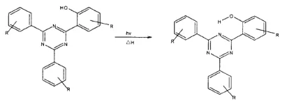 三嗪类紫外线吸收剂与二苯甲酮类和苯并三氮唑紫外线稳定剂的稳定机理相类似,分子内氢键发生破坏,形成下图所示环状互变异构体:
