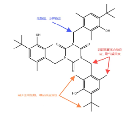 为什么酚类抗氧剂容易产生气熏黄变?传统的受阻酚抗氧剂羟基的邻位有两个叔丁基分子,空间位阻大,反应活性小,易使塑料制品着色。一般认为,受阻酚抗氧作用的关键在于它所含的反应羟基,羟基与自由基的反应活性受到其邻位R基的空间阻碍的影响。R基越大,阻碍越大,反应活性越小。大的叔丁基基团的空间位阻对酚羟基具有保护作用,能保护酚羟基不被氧化消耗并起到减少电荷转移的络合作用。