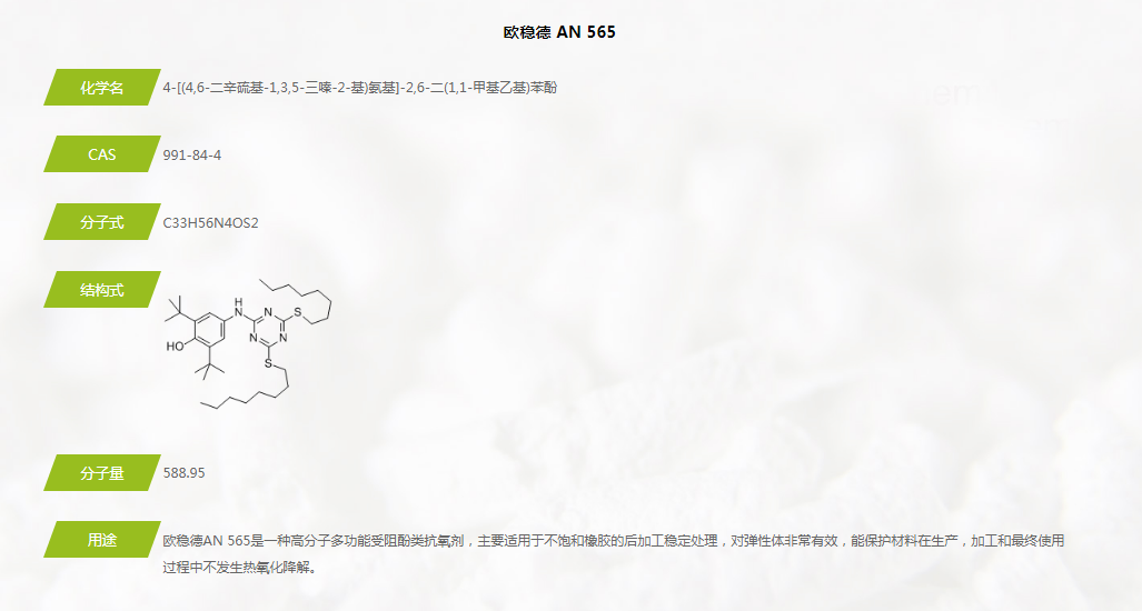 OMNISTAB® AN565 is a high molecular weight multifunctional hindered phenolic antioxidant. It is mainly suitable for post-processing and stable treatment of unsaturated rubber. It can protect them aterial from thermal oxidative degradation during production, processing and final use. OMNISTAB® AN565 has a small addition amount, low volatility, high color fastness, and it can prevent the formation of gel.