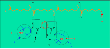 A染料结合位置B染料和基体稳定位置C芳香胺基团-热稳定性和基体结合位置