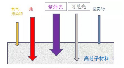 空气中的氧气和阳光中的紫外光导致塑料材料发生热氧化和光氧化反应,使塑料制品的外观和物理力学性能变差,提前失去原有功能和使用价值。主要的原因是光引起的自由基反应、化学键变化、链式反应、自催化等过程,从而使分子链断裂、交联等,特别是在不定型态区域,以断链等形式老化降解,这种效果一旦启动,如不制止,将以几何倍数加速。表面最为明显,但也会逐渐涉及到内部。