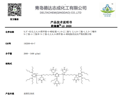 综上,欧稳德 LS2020是可以作为聚烯烃(PP、PE),烯烃共聚物(例如EVA)以及聚丙烯的混合物与弹性体的高效光稳定剂使用。并在特定情况下,欧稳德 LS2020在聚缩醛、聚酰胺、聚氨酯、软质和硬质PVC以及PVC混合物以及某些苯乙烯弹性体和特种胶粘剂中也具有非常优异的性能。