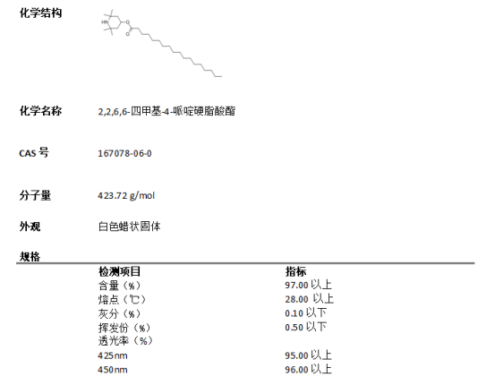 3、相比其他小分子量受阻胺光稳定剂,UV3853分子中都有较长的烷基链保证了其在聚烯烃中具有卓越的相容性和溶解性,无喷霜现象。